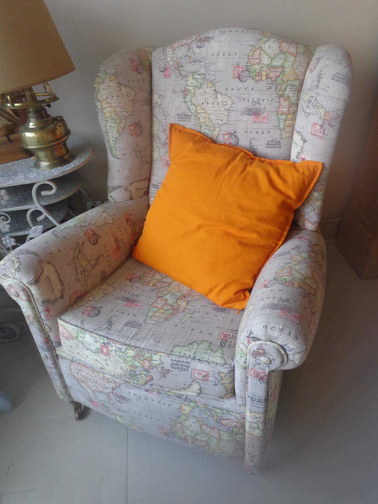 Sillon tapizado con tela de dibujos de un mapa.